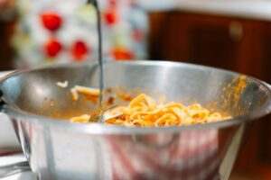 お母さんは,茹でたスパゲティの入った鍋にトマトソースを入れると,