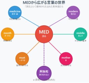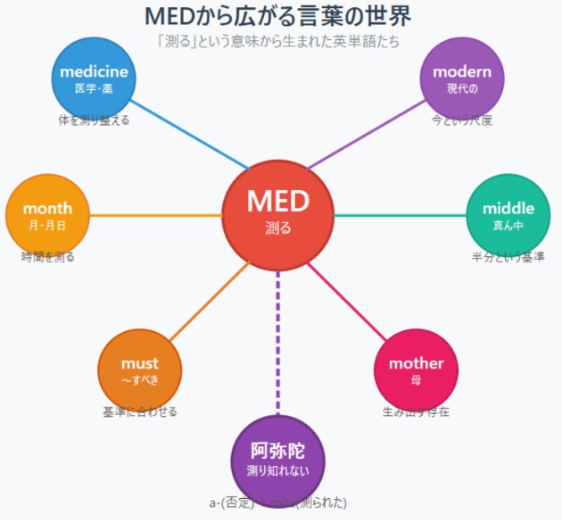 一つの古い言葉「MED(測る)」から、多くの英単語へとつながる…。