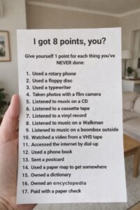 “Give yourself 1 point for each thing you’ve NEVER done:”