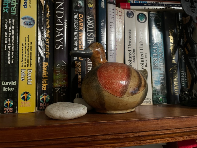 50セントのコーヒーマグ、80年代のブローチ、そしてなぜか妙に気になる年代物のアヒルの置物。実は私はこのアヒルになぜか惹かれて、これを購入してしまいました。(笑) いつも私の部屋の本棚に、並んでいます。